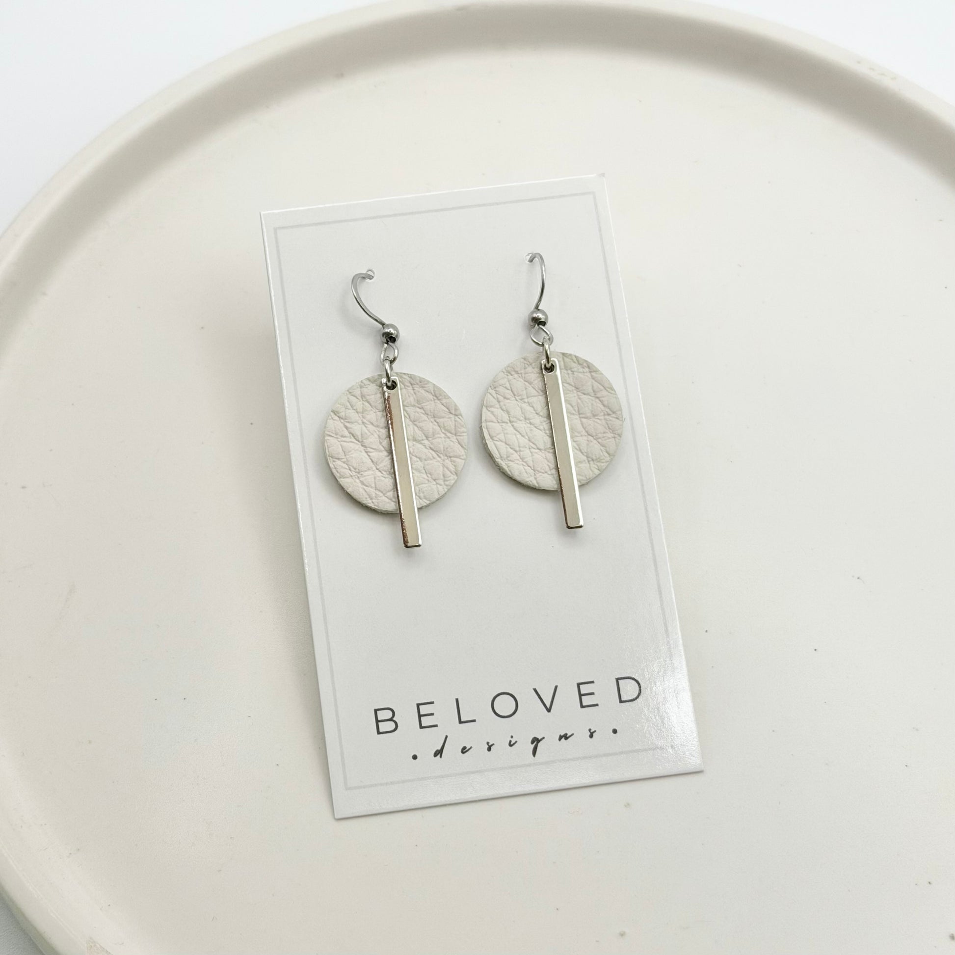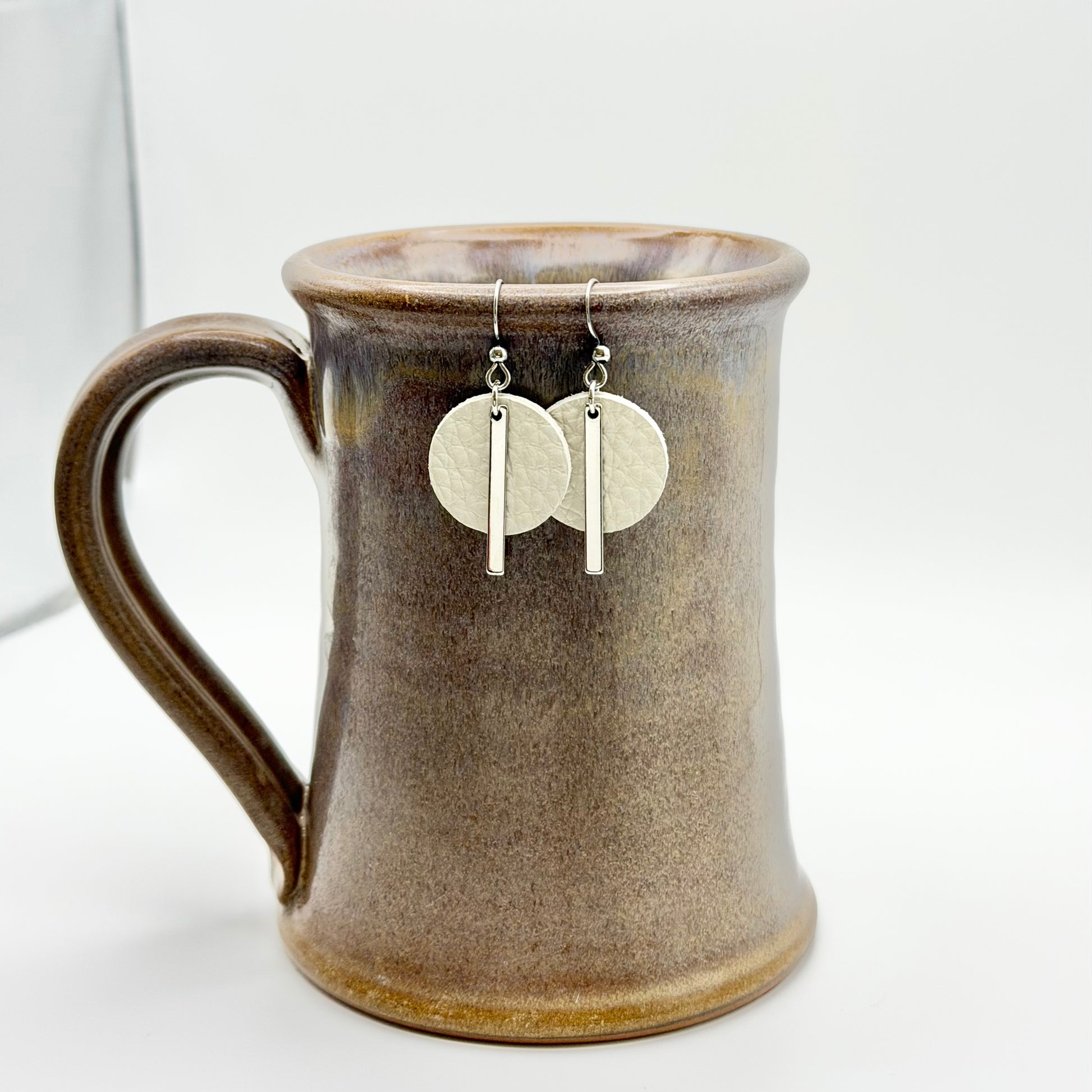 These lightweight White Leather Circle + Rhodium Bar Earrings will quickly become a staple accessory, a classic go-to pair.
