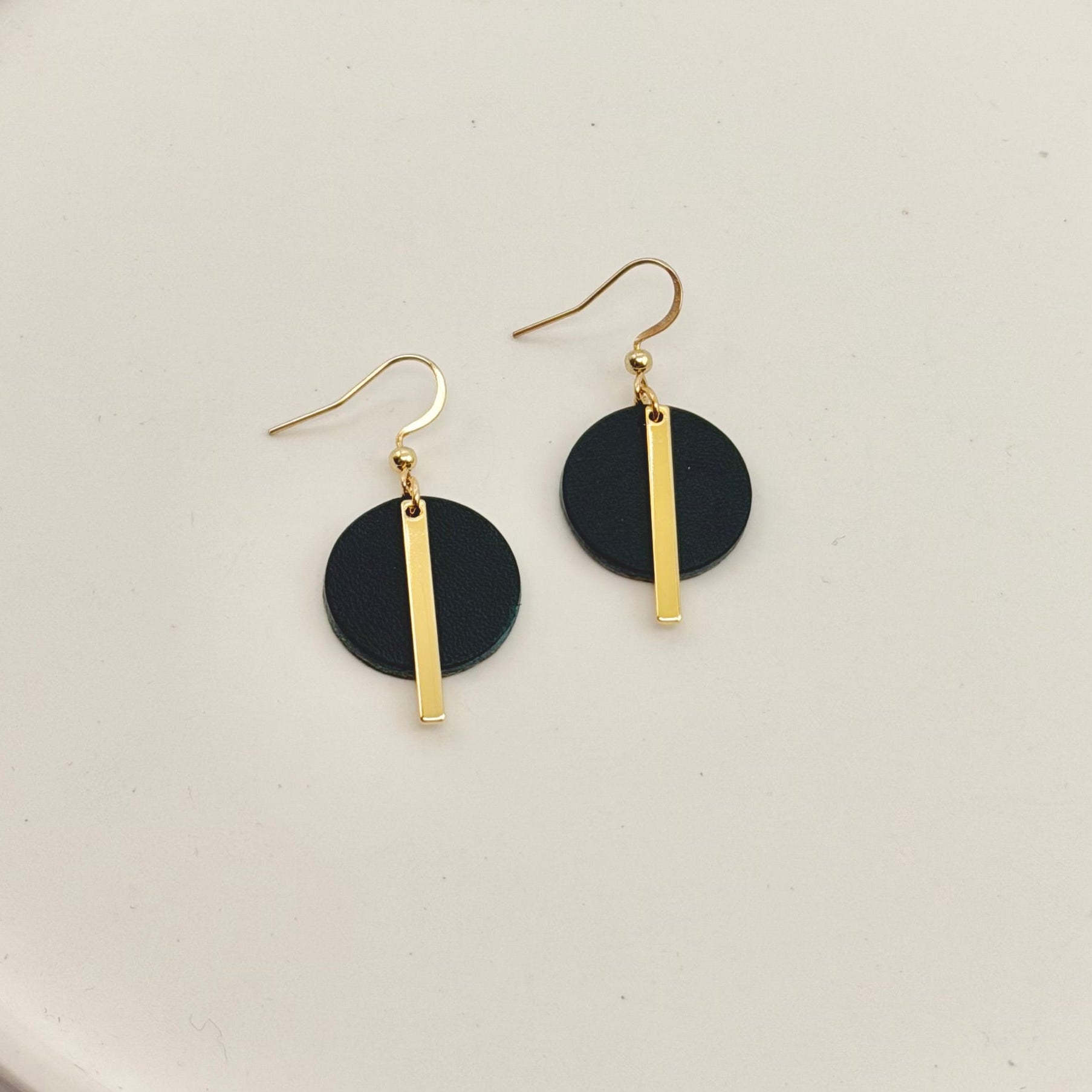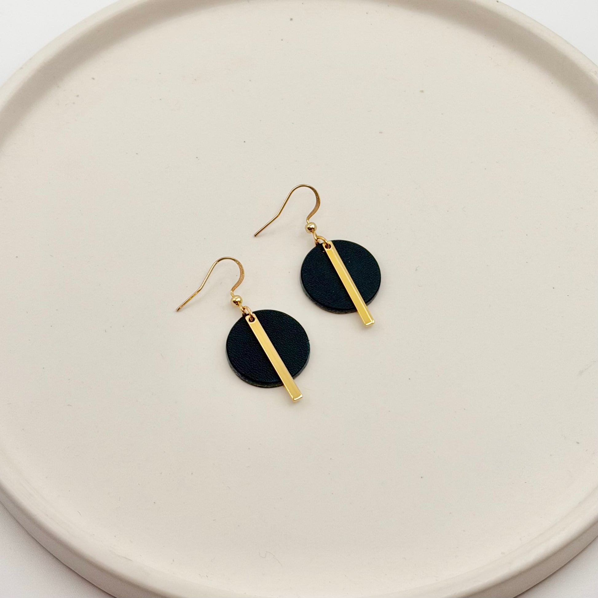 These lightweight Black Leather Circle + Gold Bar Earrings will quickly become a staple accessory, a classic go-to pair.