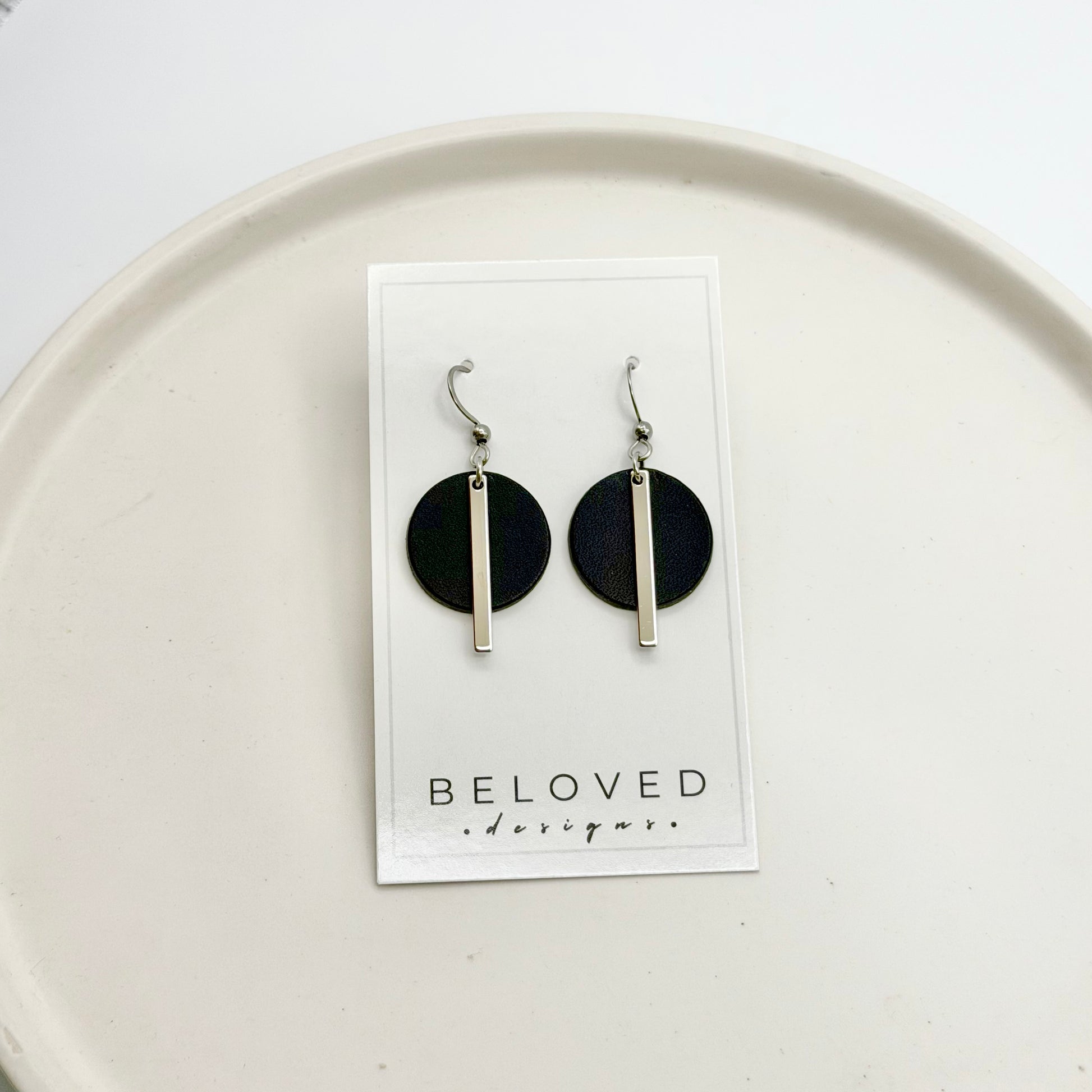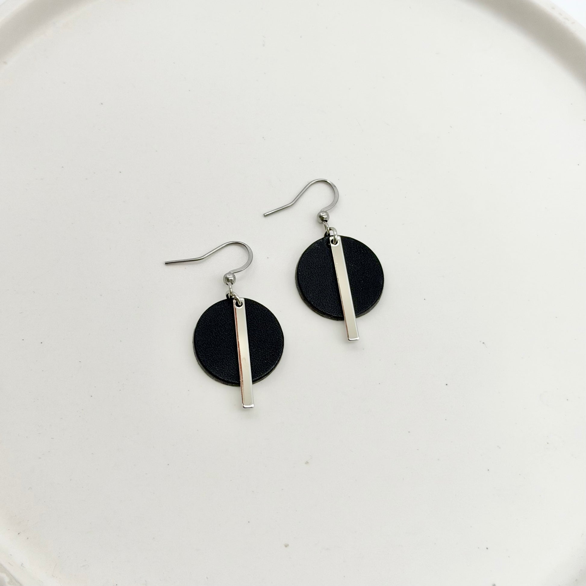 Leather Circle + Rhodium Bar Earrings | Black