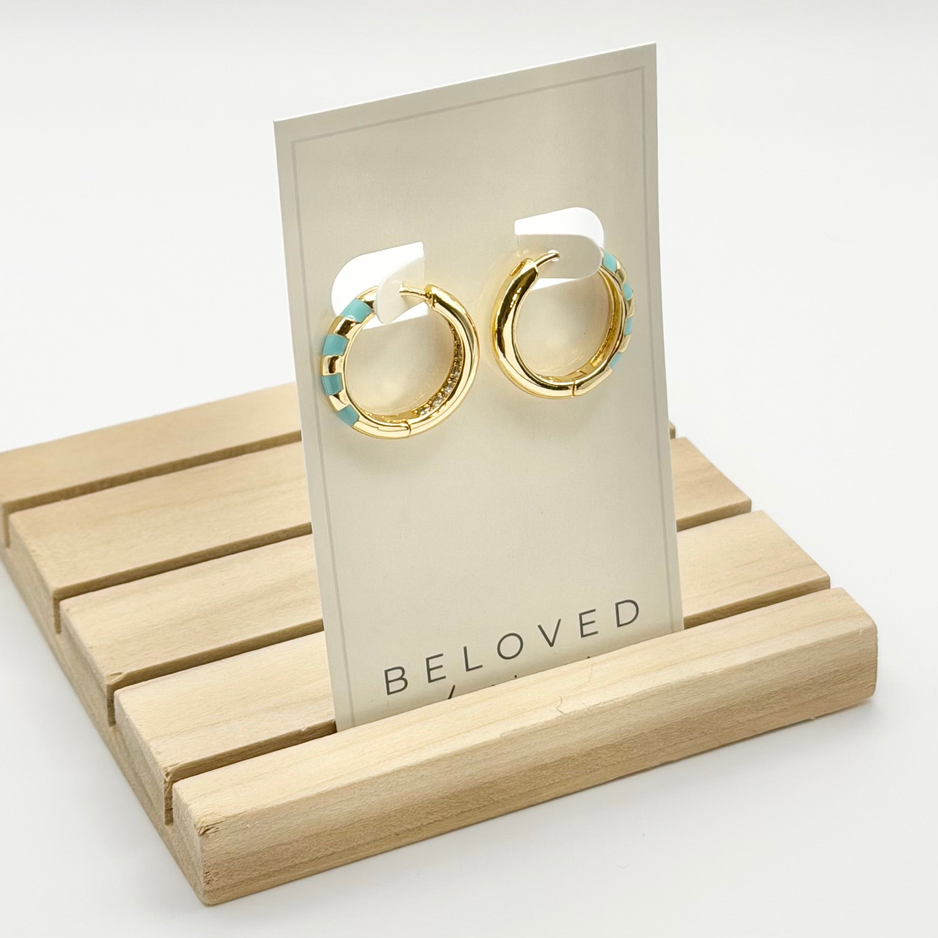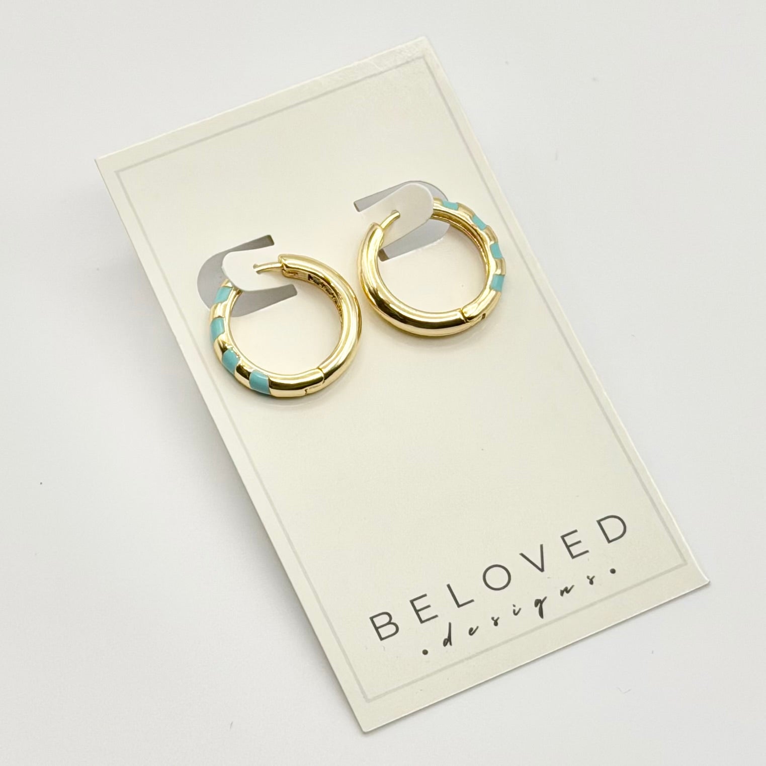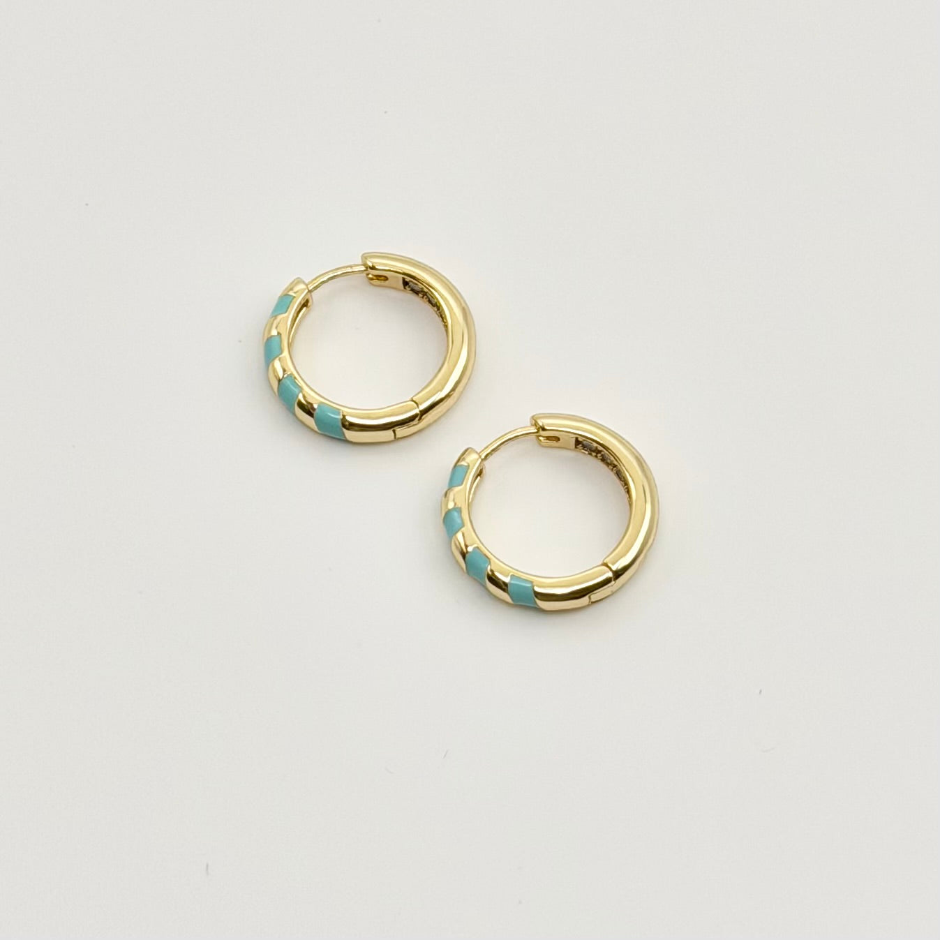 Add a delicate accent to the everyday outfit with the Gold + Turquoise Stripe Huggie Earrings.