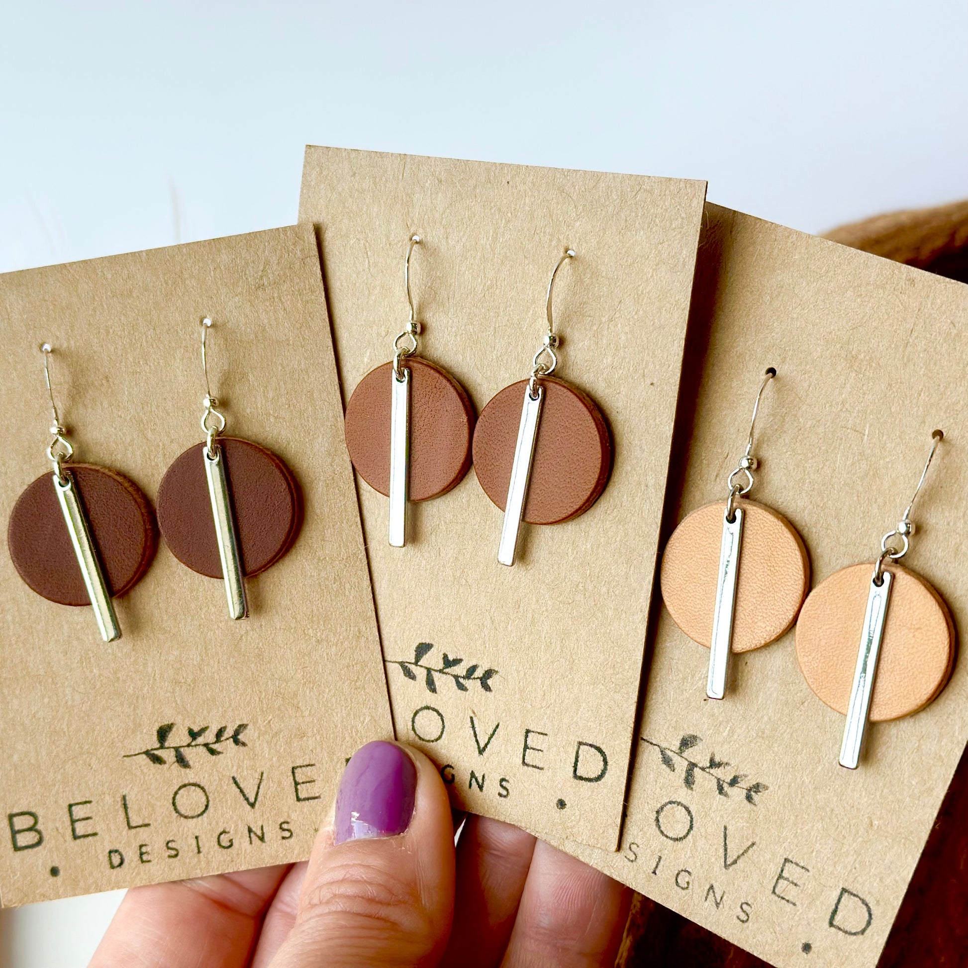 These lightweight Natural Leather Circle + Rhodium Bar Earrings will quickly become a staple accessory, a classic go-to pair.