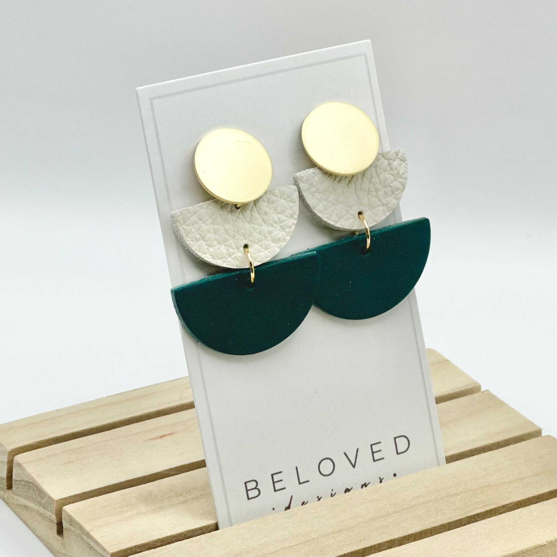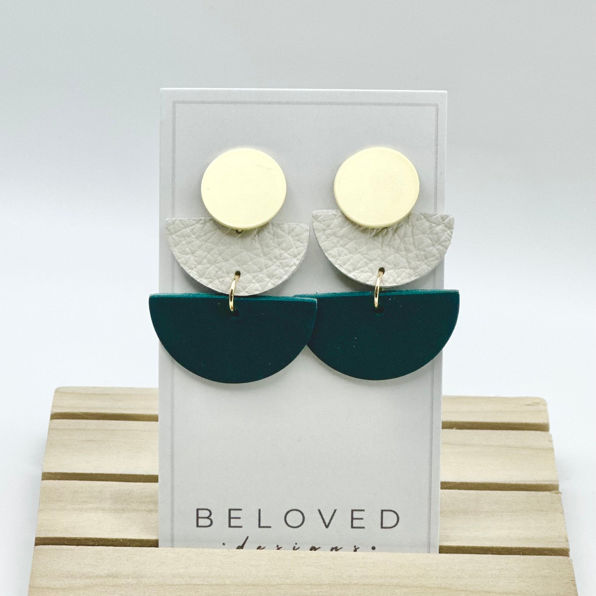 Make a bold statement with these Teal + Cream Leather Half Circle + Gold Stud Earrings! Lightweight and oh so fun!