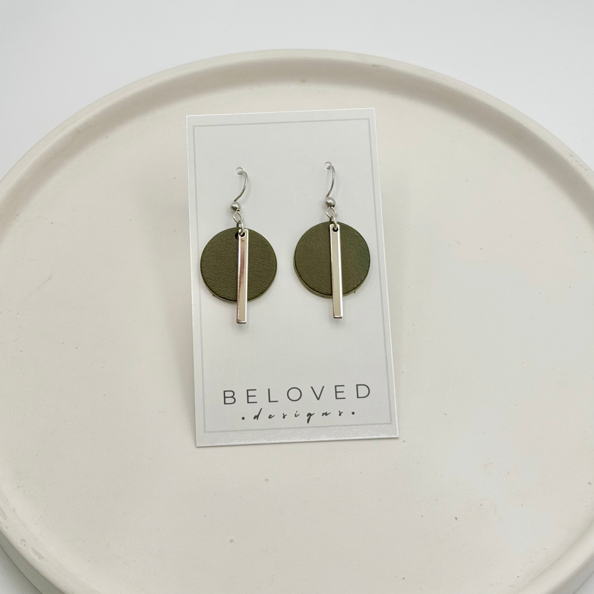 These lightweight Olive Leather Circle + Rhodium Bar Earrings will quickly become a staple accessory, a classic go-to pair.