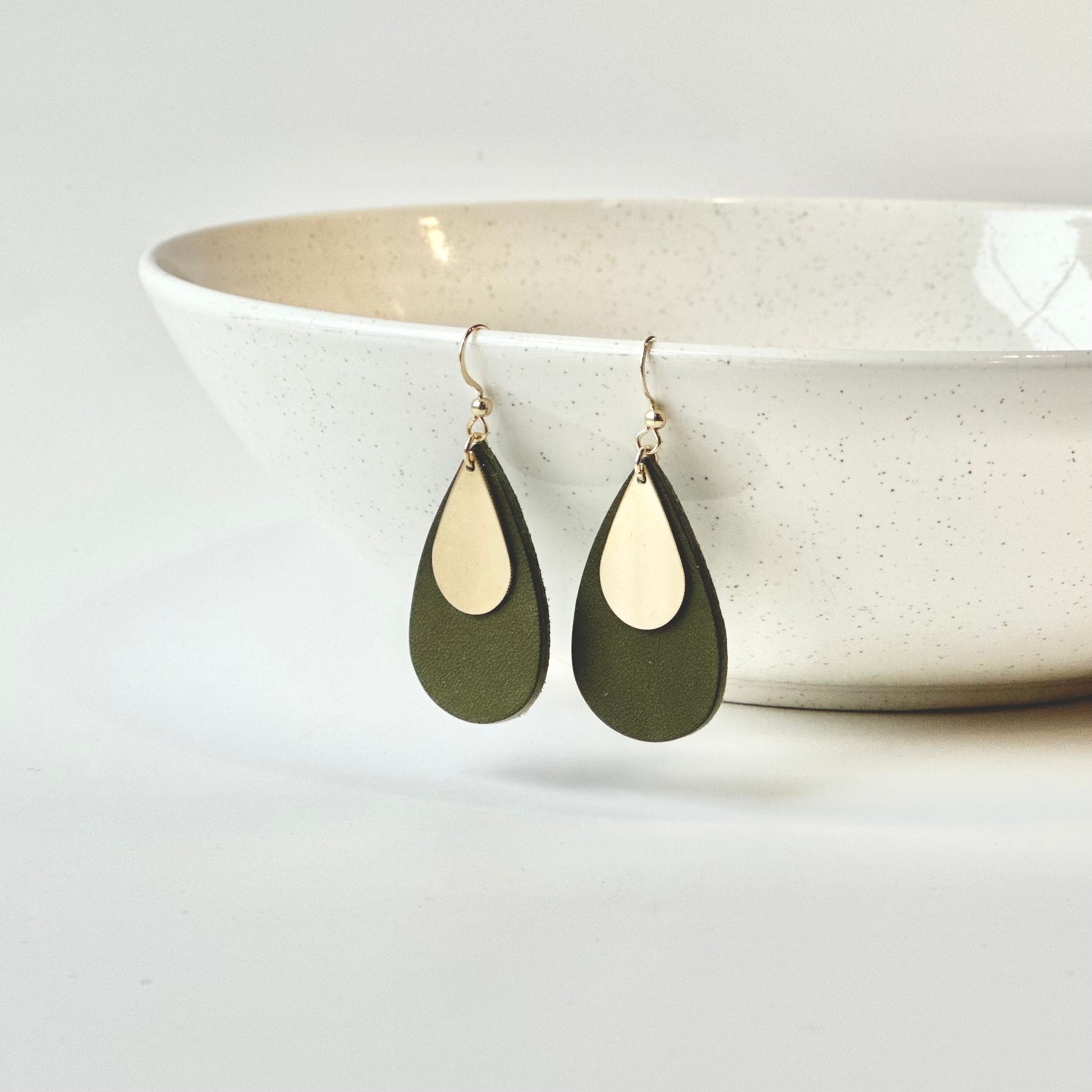 Make a statement with these Olive Leather Teardrop + Brass Earrings!