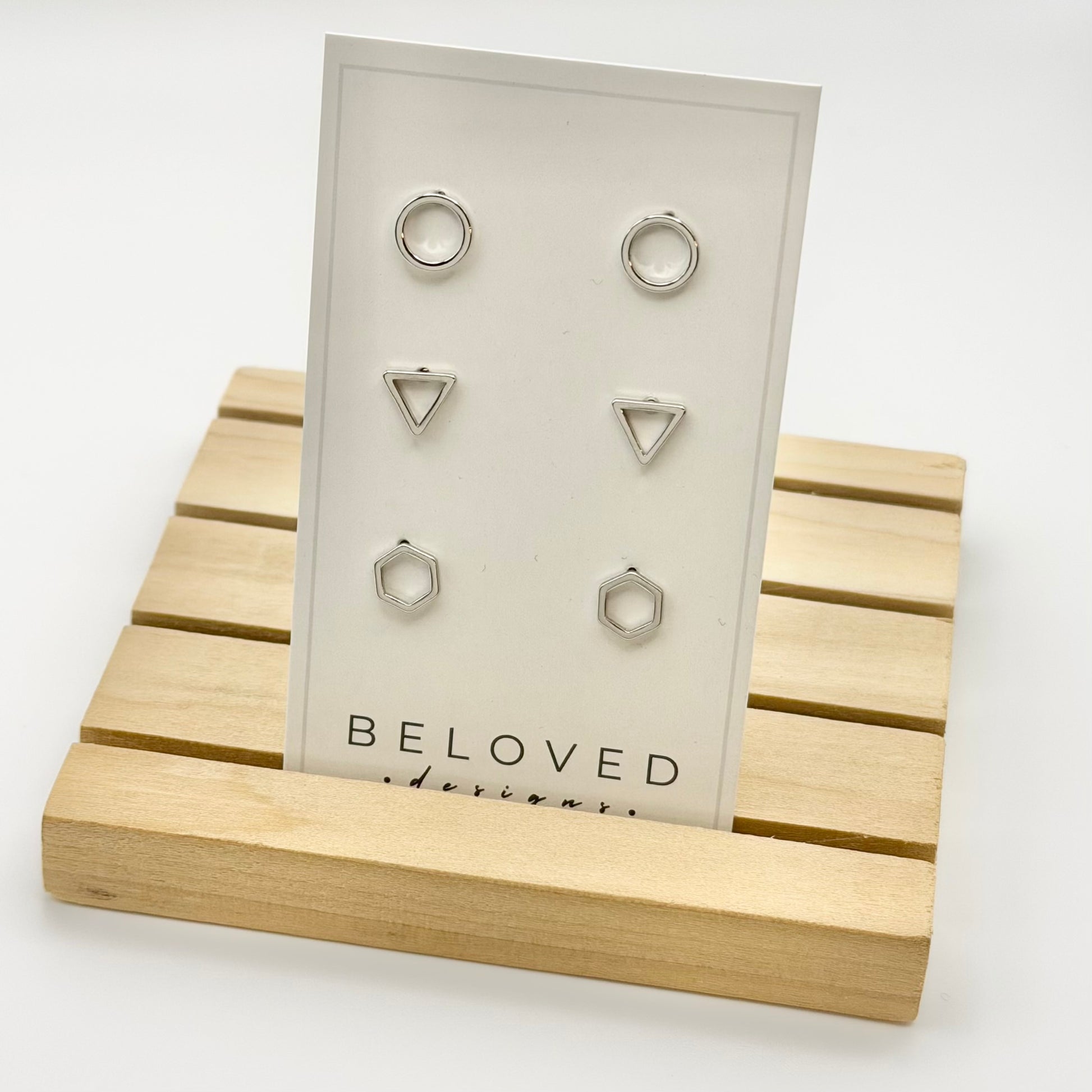 Triple the choices! Set 2 includes the open circle studs, open triangle studs, and open hexagon studs.