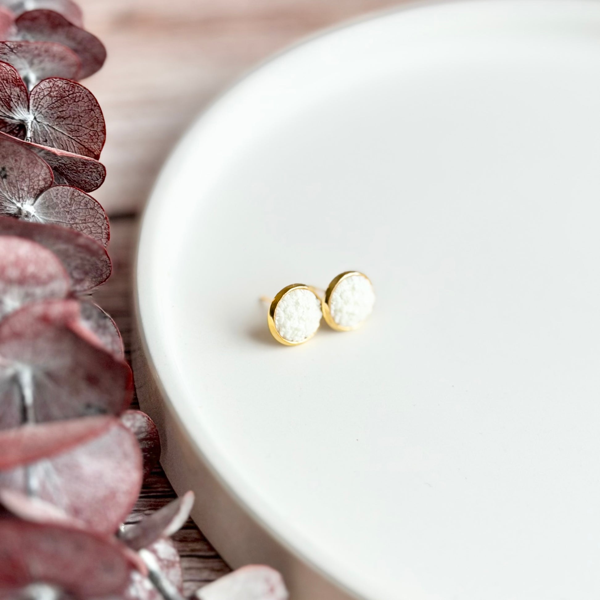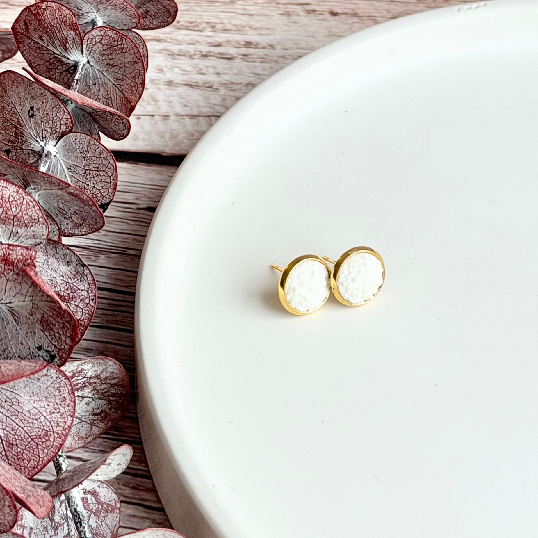 These earrings are made from gold-plated brass and resin and are 12mm wide. All metals used are nickel and lead free.